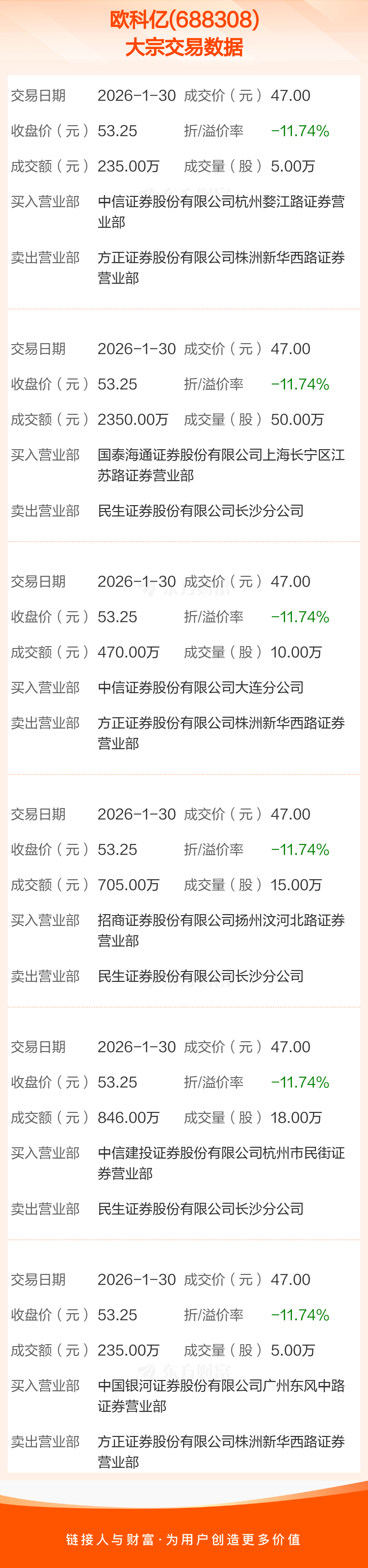 2026年1月30日,欧科亿发生6笔大宗交易,共成交103.00万股,成交金额4841.00万元,占其流通市值比例为0.57%。