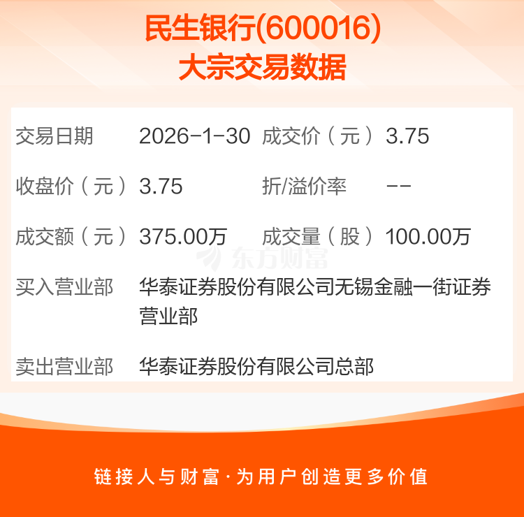 2026年1月30日,民生银行发生1笔大宗交易,共成交100.00万股,成交金额375.00万元。