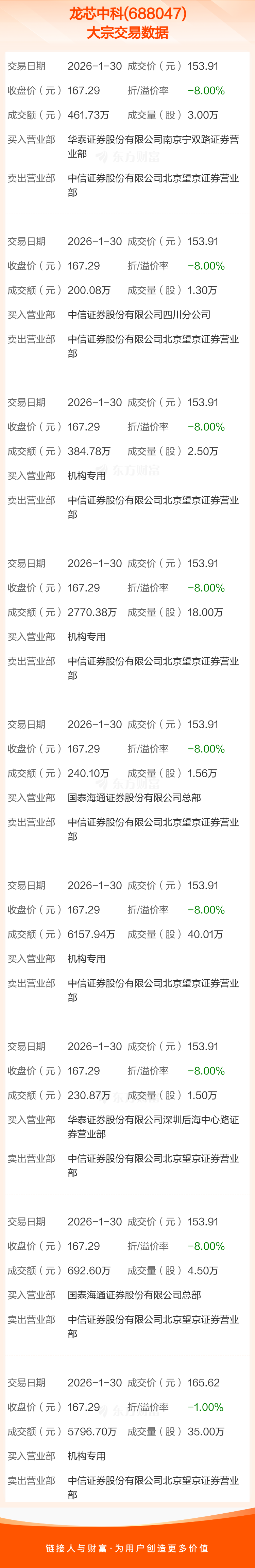 2026年1月30日,龙芯中科发生9笔大宗交易,共成交107.37万股,成交金额1.69亿元,占其流通市值比例为0.25%。