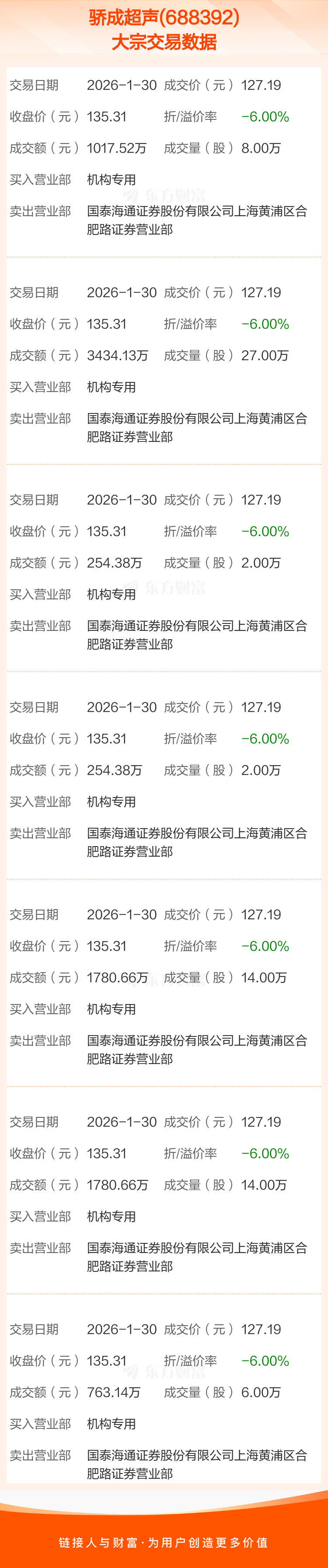 2026年1月30日,骄成超声发生7笔大宗交易,共成交73.00万股,成交金额9284.87万元,占其流通市值比例为0.59%。