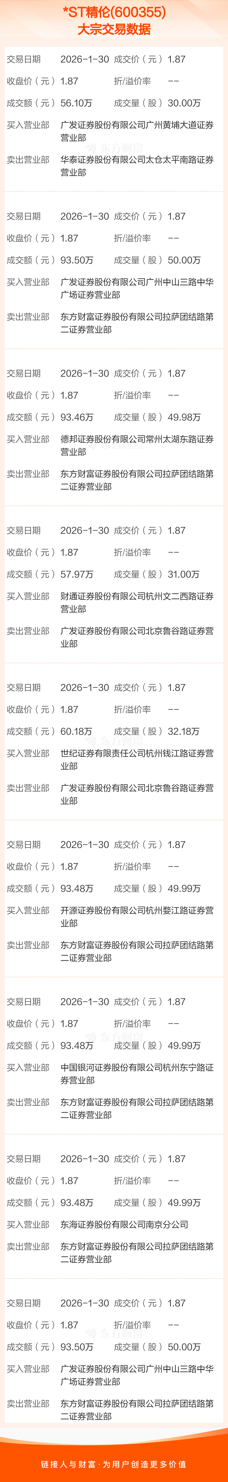 2026年1月30日,*ST精伦发生9笔大宗交易,共成交393.13万股,成交金额735.15万元,占其流通市值比例为0.80%。