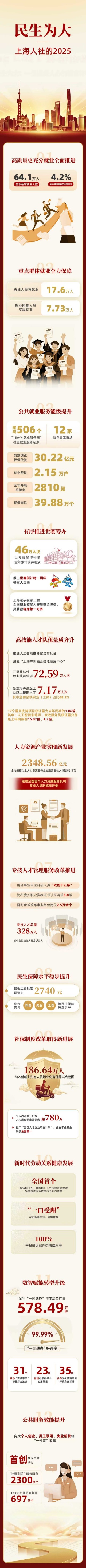 2025年,上海市人社系统坚持稳中求进,全力以赴稳就业、惠民生、抓改革、促发展,高质量完成全年目标任务。全年推出一系列新政,包括扩大社保补贴实施范围、阶段性缓缴社会保险费、创设临时性公益性岗位和“人工智能推介官”、实施产假社保补贴等,聚焦重点产业、新兴消费热点、公益性服务等领域挖掘就业增长点,充分挖掘重点产业与新兴领域就业潜力。