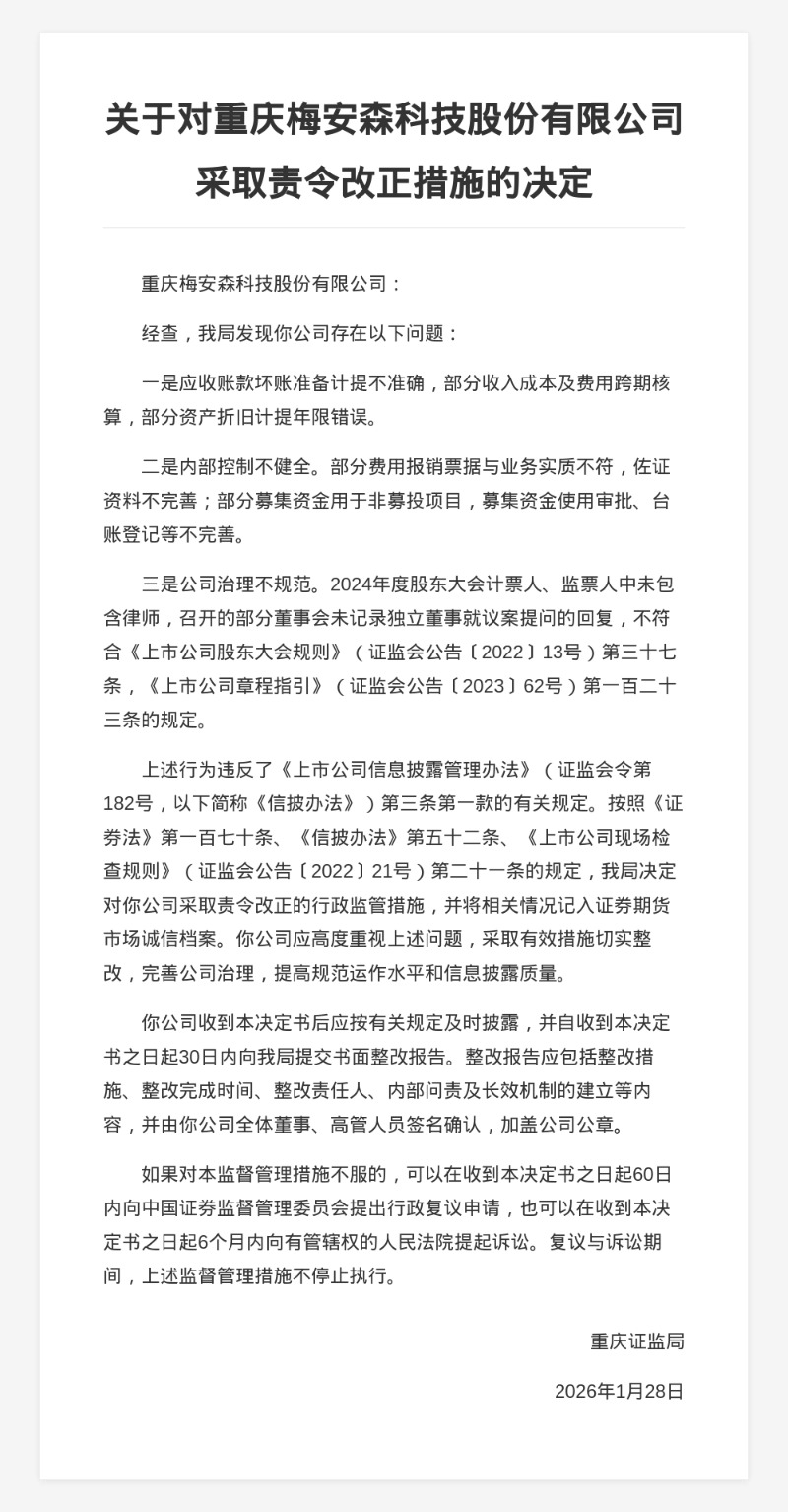 重庆梅安森科技被责令改正,涉公司治理不规范等