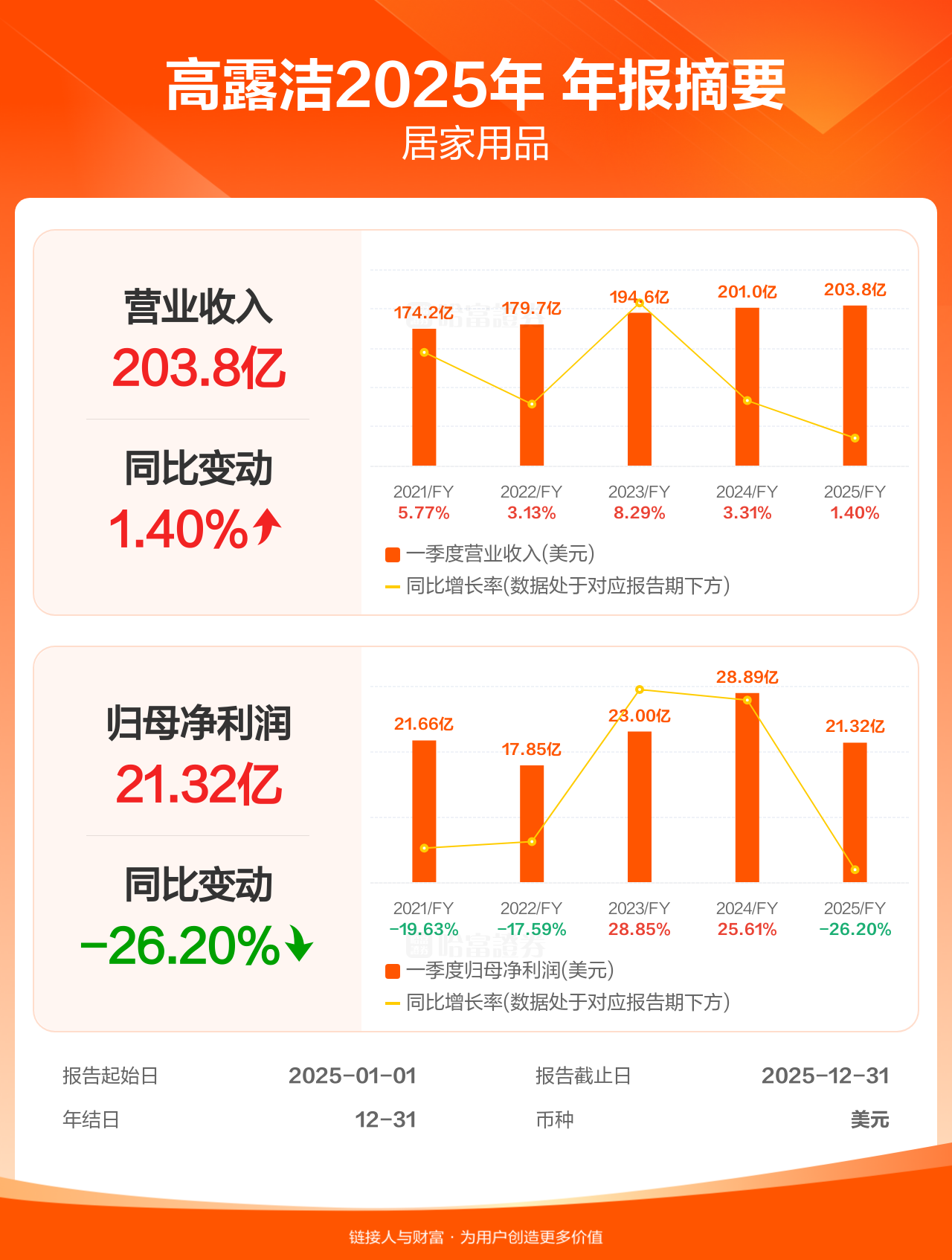 高露洁1月30日发布年报业绩,截至2025年12月31日的12个月内,该公司营业收入203.82亿美元,同比增长1.40%;公司权益持有人应占溢利(归母净利润)21.32亿美元,同比减少26.20%。