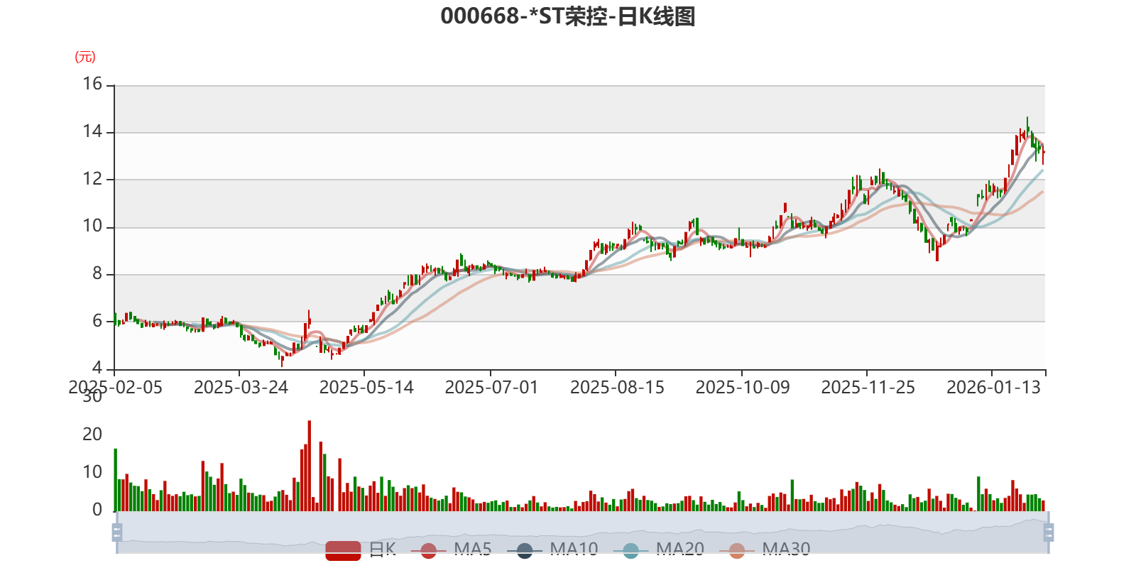 中证智能财讯 *ST荣控(000668)1月30日晚间披露2025年度业绩预告,预计2025年实现营业收入3.6亿元至4.1亿元;归母净利润2500万元至3500万元,上年同期亏损3.68亿元;扣非净利润预计2500万元至3500万元,上年同期亏损3.77亿元;基本每股收益0.17元/股-0.24元/股。以1月30日收盘价计算,*ST荣控目前市盈率(TTM)约为55.34倍-77.47倍,市净率(LF)约2.74倍,市销率(TTM)约5.03倍。