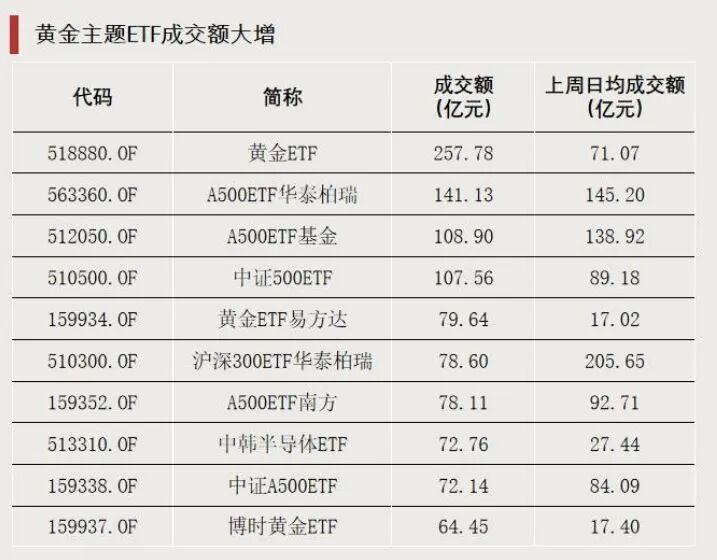 成交额方面,宽基指数ETF成交继续降温,沪深300ETF华泰柏瑞成交额仅78.6亿元,较上周日均成交额明显减少。黄金ETF、黄金ETF易方达、博时黄金ETF等产品成交额大增。