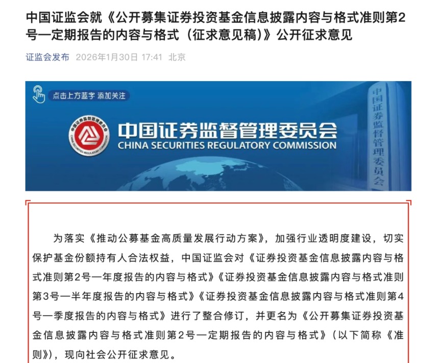 1月30日,中国证监会发布消息称,为落实《推动公募基金高质量发展行动方案》,加强行业透明度建设,切实保护基金份额持有人合法权益,对《证券投资基金信息披露内容与格式准则第2号—年度报告的内容与格式》《证券投资基金信息披露内容与格式准则第3号—半年度报告的内容与格式》《证券投资基金信息披露内容与格式准则第4号—季度报告的内容与格式》进行了整合修订,并更名为《公开募集证券投资基金信息披露内容与格式准则第2号—定期报告的内容与格式》(以下简称《准则》),并向社会公开征求意见。