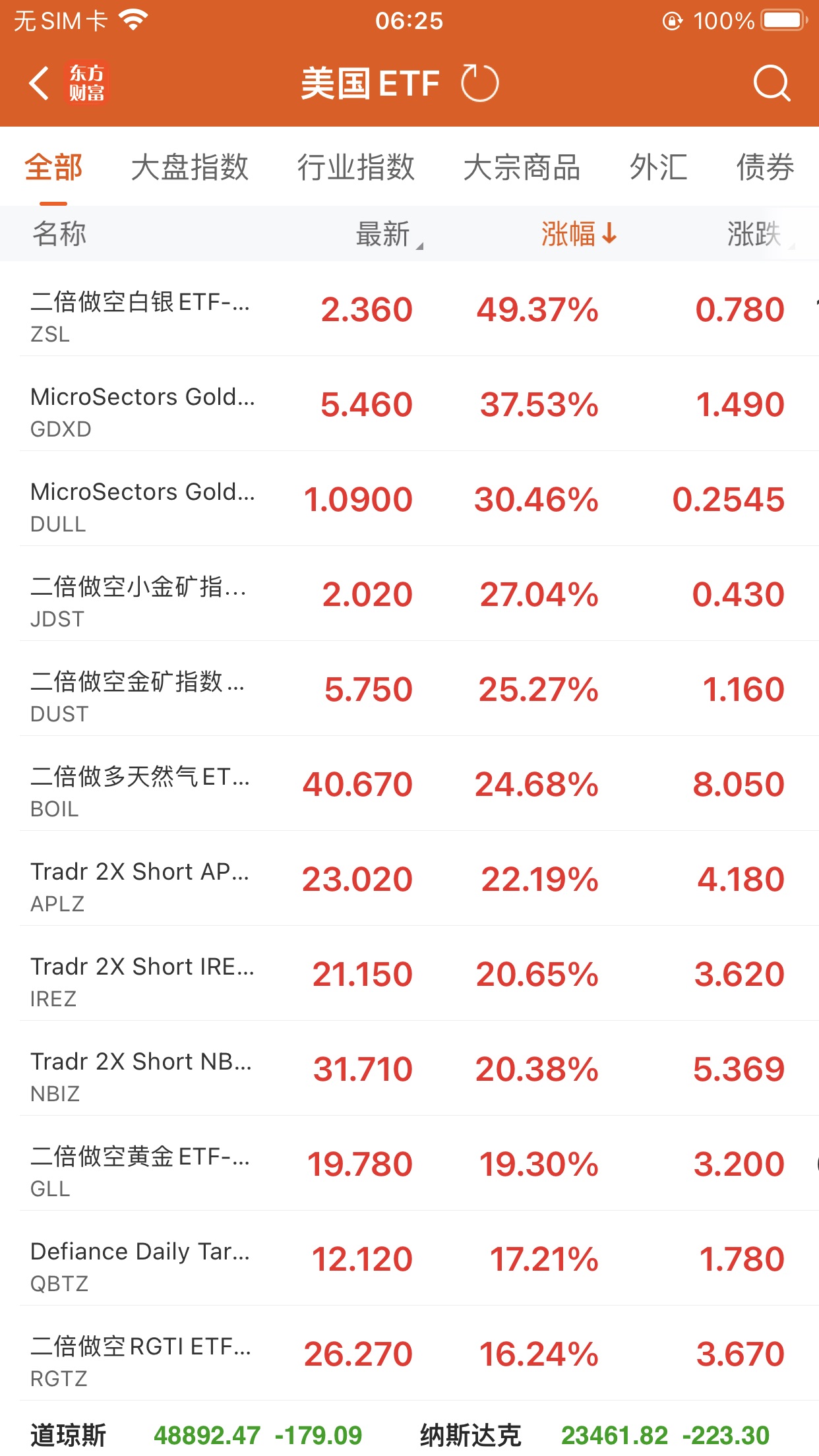 Proshares二倍做空白银ETF(ZSL.US) 升49.37%,成交额22.58亿美元。