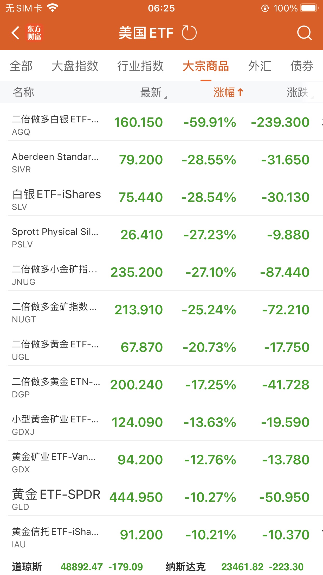 白银ETF-iShares(SLV.US) 跌28.54%,成交额400.41亿美元。