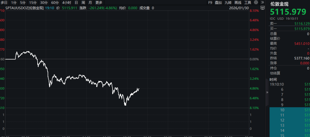 在国际银价大跌的同时,其他多个贵金属品种价格也迎来暴跌,其中伦敦金现价格一度重挫逾8%,盘中一度跌破5000美元/盎司。而就在上一交易日,伦敦金现价格最高还一度接近5600美元/盎司。