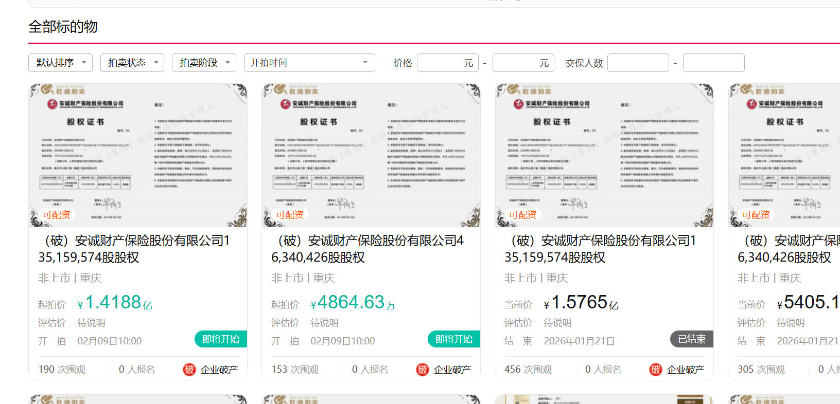 与此同时,安诚财险的股权变动亦持续引发市场关注,多名股东筹划离场。譬如,公司第四大股东重庆公路集团将其所持4.45%股权(对应1.82亿股)拆分成两笔,在阿里资产拍卖平台多次挂牌,历经数轮流拍、降价仍无人接手。记者注意到,这两笔股权将于2月9日再度开拍,起拍价从去年11月的2.90亿元下调至1.91亿元。