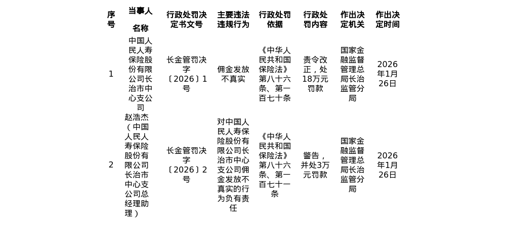 蓝鲸新闻1月30日讯,近日,国家金融监督管理总局长治监管分局发布了罚单,剑指中国人民人寿保险股份有限公司长治市中心支公司及其相关责任人。