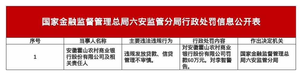 安徽霍山农商行被罚60万,涉违规发放贷款等