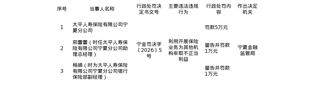 针对这一行为,国家金融监督管理总局宁夏监管分局对其罚款5万元;对时任太平人寿保险有限公司宁夏分公司助理总经理的邢蕾蕾、银行保险部副经理的杨娟,分别警告并处罚款1万元。