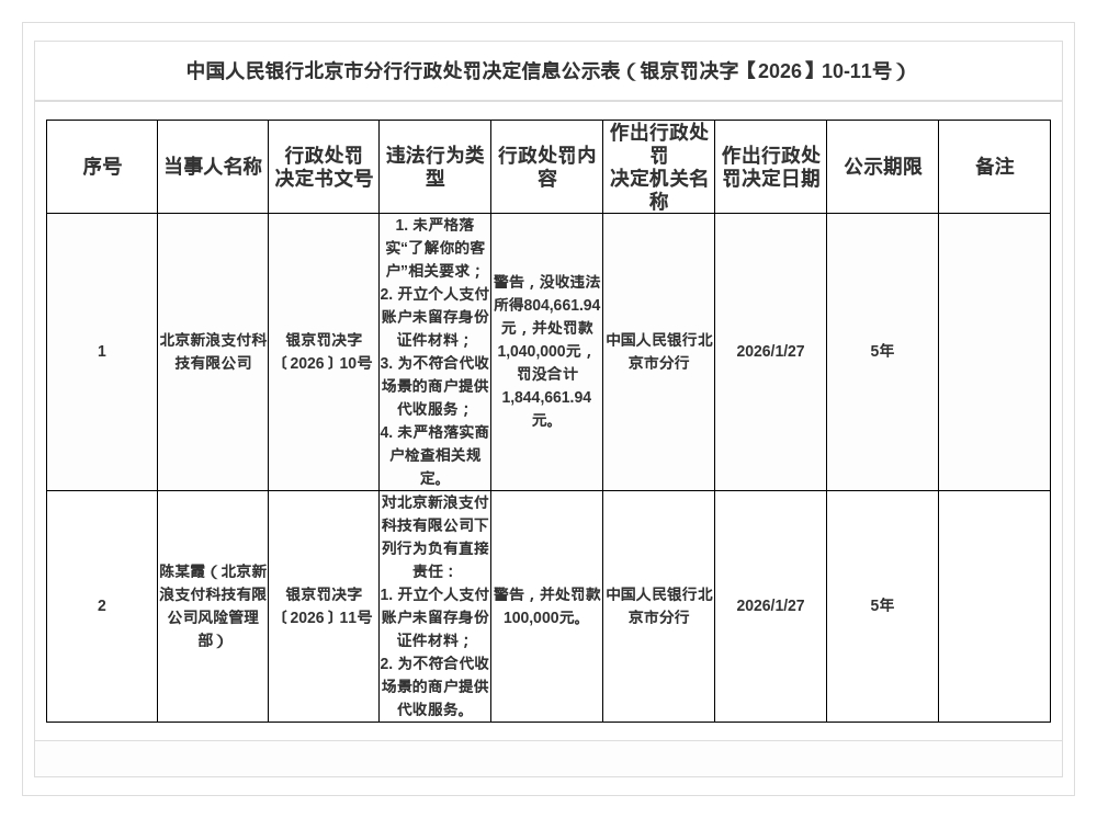 北京新浪支付被罚没合计184.47万,涉未严格落实商户检查规定等