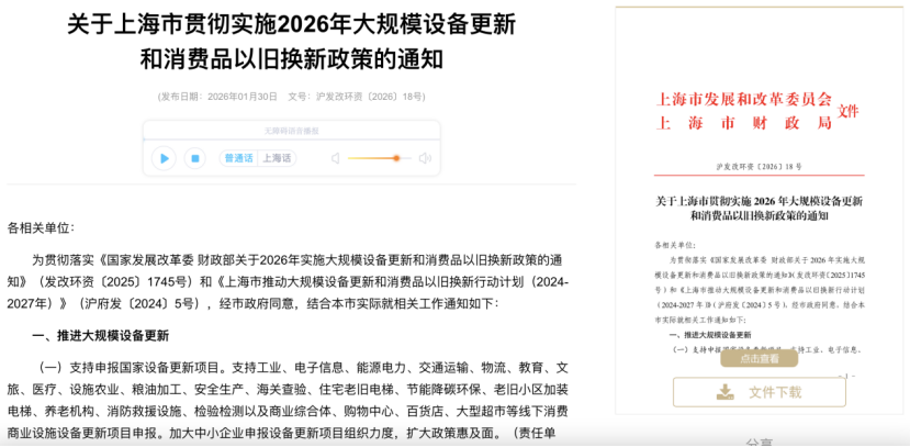 1月30日,上海市发改委、上海市财政局发布《关于上海市贯彻实施2026年大规模设备更新和消费品以旧换新政策的通知》(以下简称“通知”),其中明确,支持工业、电子信息、能源电力、交通运输等线下消费商业设施设备更新项目申报。
