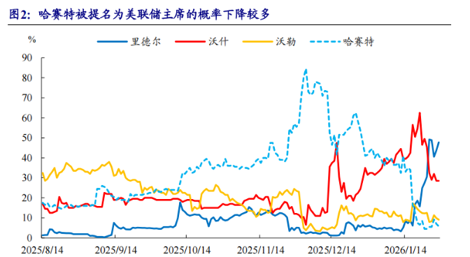 由于5月份鲍威尔的主席任期届满,在美联储短期内难以降息的情况下,我们需要关注新主席人选变化可能造成的市场波动。前期比较可能性最大的哈赛特,由于被质疑可能会过于顺从特朗普,被提名的概率下降较多,市场目前预期里克·里德尔可能会被提名为新主席,且其以往的观点较为鸽派,倾向于多降息。我们认为,无论谁成为美联储新主席,最终在2026年能发挥的作用都有限。但不同的人选可能会对市场造成一定的冲击,若里德尔被提名为新主席,考虑到其以往立场偏鸽派,市场可能会交易美联储多降息,从而刺激美国通胀上移,带来美债、黄金等资产的波动。