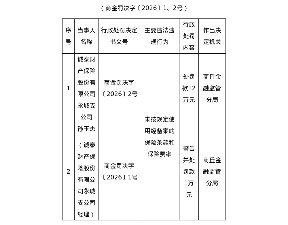 诚泰财险永城支公司被罚12万,涉未按规定使用保险条款和费率