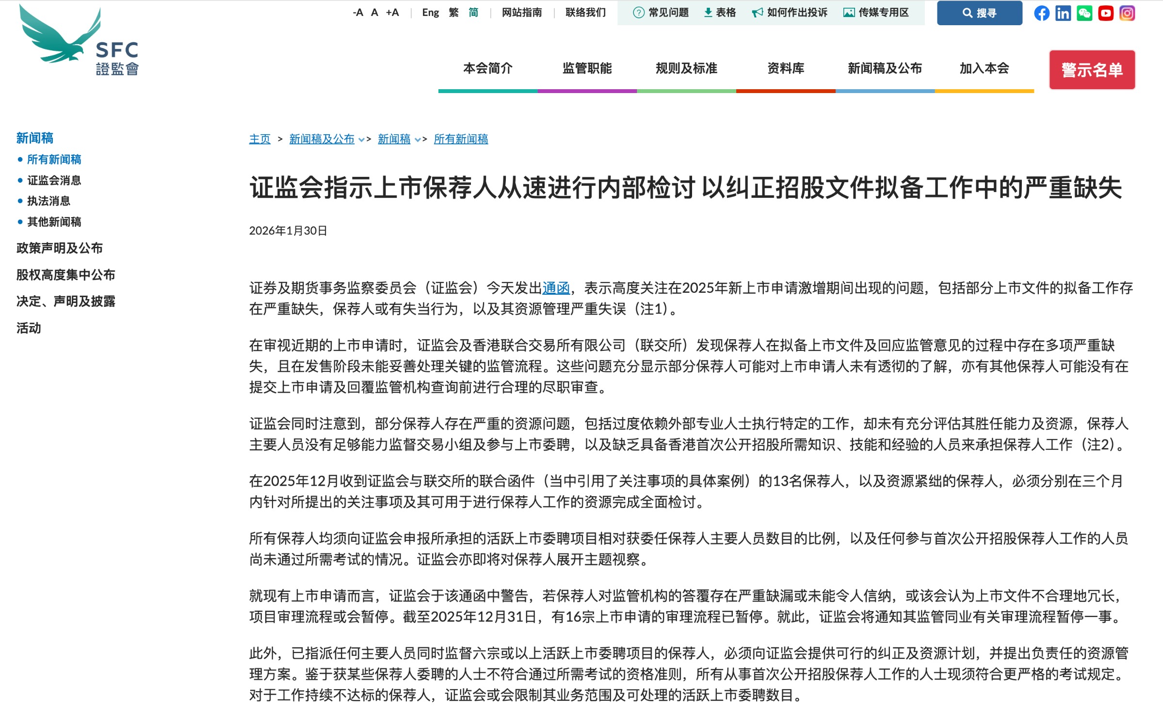 1月30日,香港证券及期货事务监察委员会(以下简称“香港证监会”)发出通函,表示高度关注在2025年新上市申请激增期间出现的问题,包括部分上市文件的拟备工作存在严重缺失,保荐人或有失当行为,以及其资源管理严重失误。