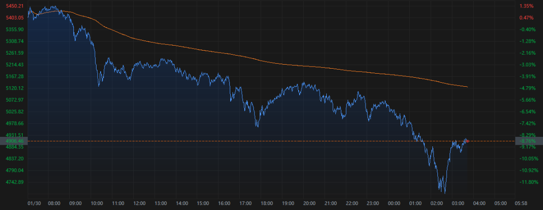 据财联社报道,周五(1月30日)纽约时段,国际贵金属价格大幅跳水,其中现货白银一度跌超36%,黄金最高跌超12%。