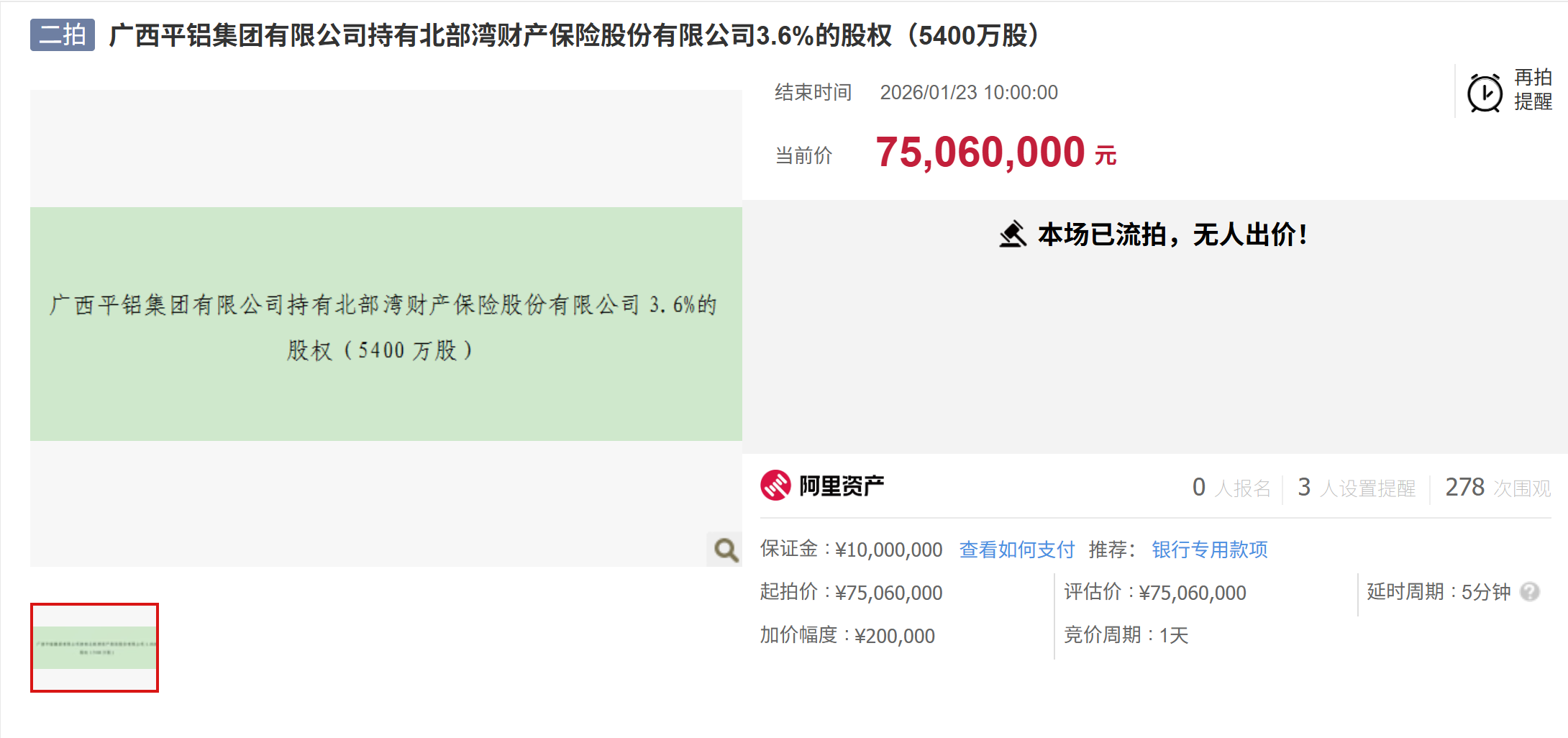 1月30日,记者在阿里资产拍卖平台注意到,广西平铝集团有限公司(下称“广西平铝集团”)持有的北部湾财产保险股份有限公司(下称“北部湾财险”)9000万股股权(占公司总股本6%)二拍已收官,最终因无人出价而流拍。