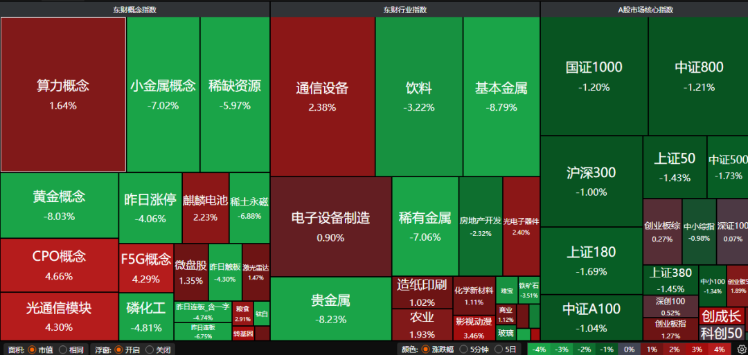 A股三大指数昨日涨跌不一,沪指跌0.96%,深证成指跌0.66%,创业板指涨1.27%。沪深京三市成交额超过2.8万亿。行业板块涨少跌多,农牧饲渔、造纸印刷、通信设备板块涨幅居前,贵金属、能源金属、采掘行业、有色金属、小金属、珠宝首饰、酿酒行业跌幅居前。