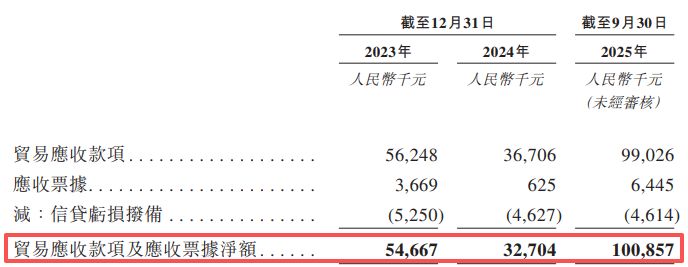截至2025年三季度末,星辰天合的贸易应收款项及应收票据余额攀升至约1.01亿元,而截至2024年底仅为3270.4万元。短短9个月内,其应收账款规模增长了约2倍,其增速远超同期65.4%的营收增速。