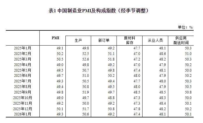 中新网1月31日电据国家统计局网站消息,国家统计局、中国物流与采购联合会31日发布2026年1月中国采购经理指数运行情况。