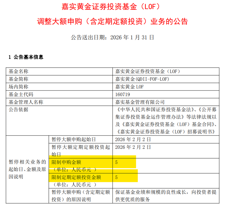 1月30日晚间,嘉实黄金LOF公告称,自2月2日起对本基金的申购(含定期定额投资)业务限额调整为:本基金单个开放日每个基金账户的累计申购(含定期定额投资)金额不得超过5元,如超过5元,本基金管理人将有权拒绝。