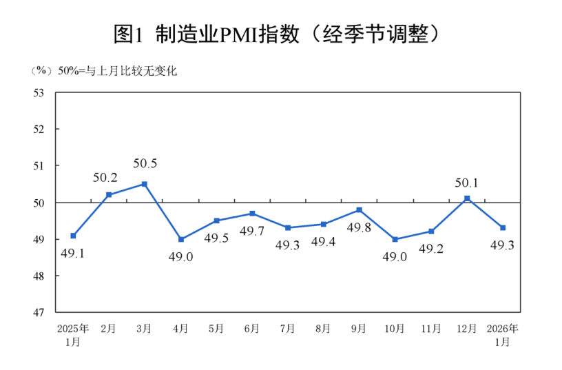 国家统计局1月31日发布数据显示,1月份,制造业采购经理指数(PMI)、非制造业商务活动指数和综合PMI产出指数分别为49.3%、49.4%和49.8%,比上月下降0.8个、0.8个和0.9个百分点,经济景气水平有所回落。