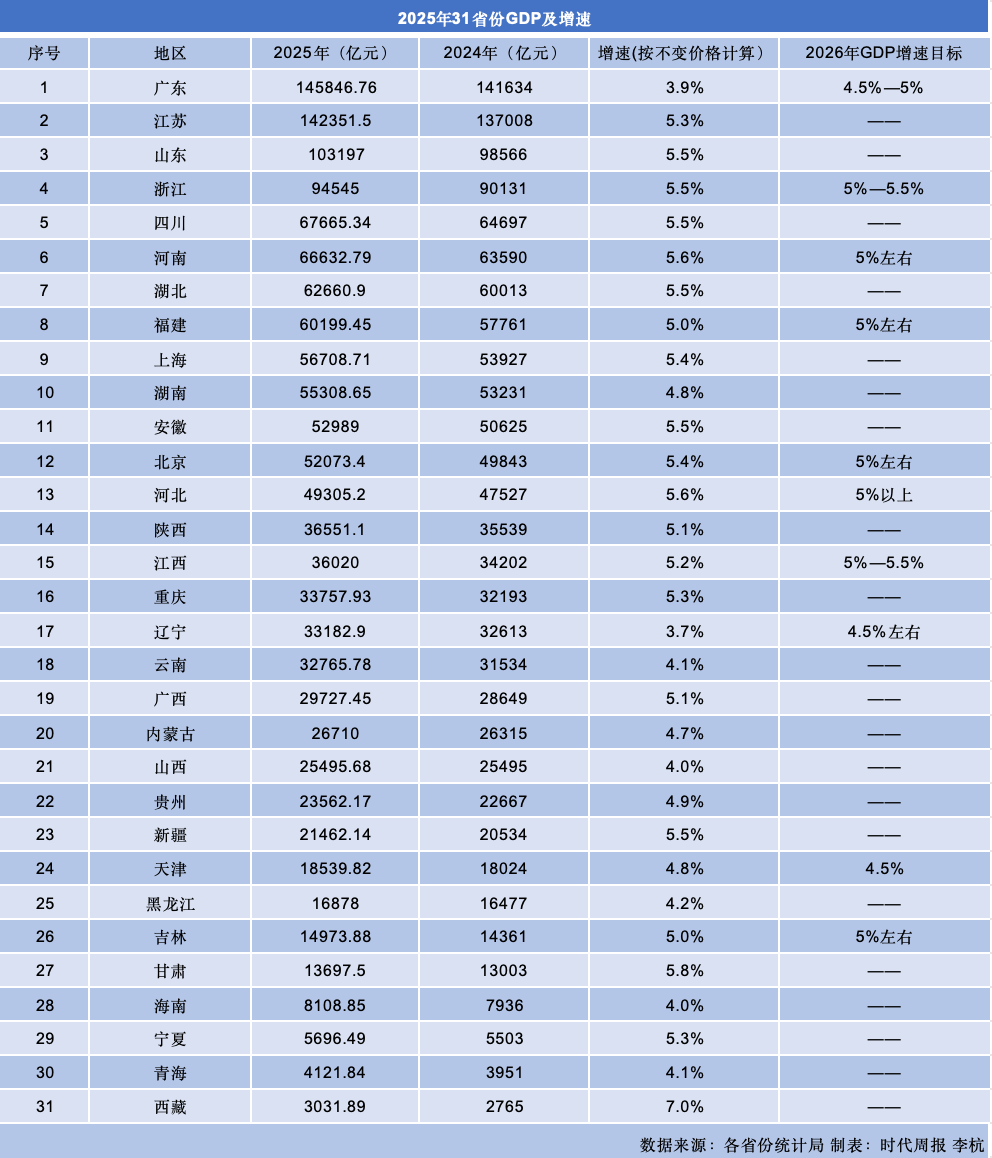 时代周报记者梳理发现,广东、江苏、山东的地区生产总值(以下简称“GDP”)继续稳居前三。增速上,18个省份跑赢“全国线”5.0%,西藏和甘肃分别以7.0%和5.8%的增速领跑全国。