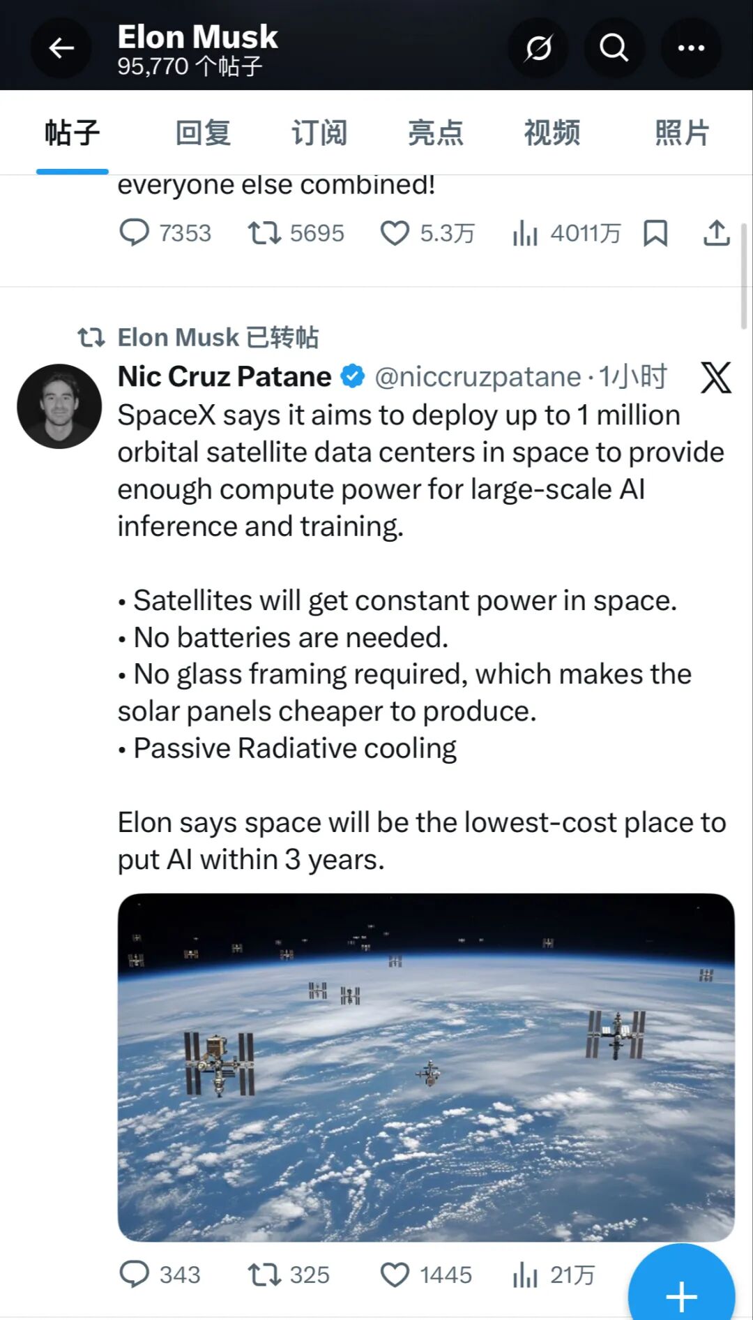 同日,马斯克在社交媒体平台上转发了分析师对上述数据中心的评论。评论分析,这些卫星将在太空中获得不间断的能源;无需电池;无需玻璃框架,这使得太阳能板的生产成本更低;散热方式为被动辐射冷却。