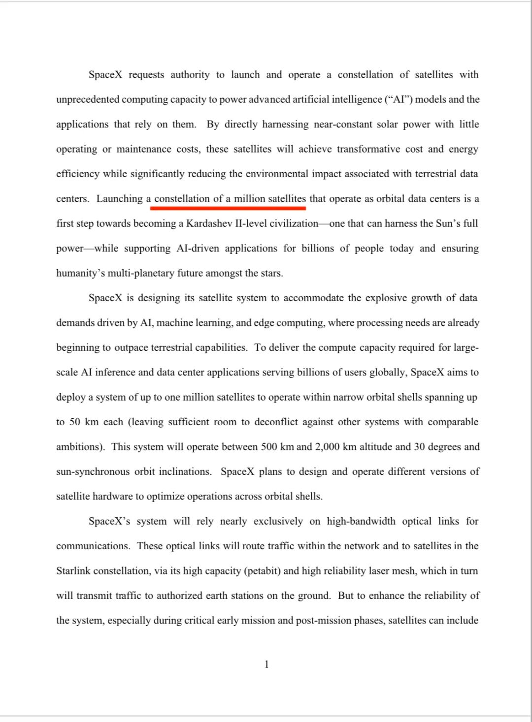1月30日,SpaceX向美国联邦通信委员会(FCC)提交了一项新申请,内容为“一个拥有前所未有的计算能力的卫星星座,可为先进的AI模型及其相关应用提供支持”。这一卫星系统将最多包含100万颗卫星,主要通过新一代重型运载火箭“星舰”发射,建立一个环绕地球的轨道数据中心网络。