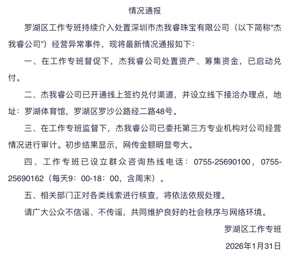 南方财经1月31日电,针对水贝深圳市杰我睿珠宝有限公司(杰我睿公司)经营异常事件,罗湖区工作专班继1月28日首次发布通报后,1月31日再度发布通报称,工作专班持续介入处置杰我睿公司经营异常事件,现将最新情况通报如下: