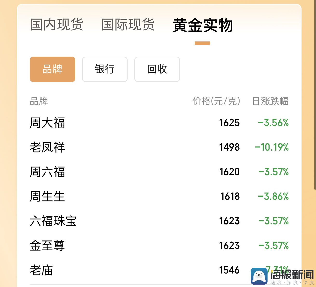 另外,老凤祥足金饰品报1498元/克,单日跌170元;老庙黄金足金饰品报1546元/克,较前一日此时跌144元。