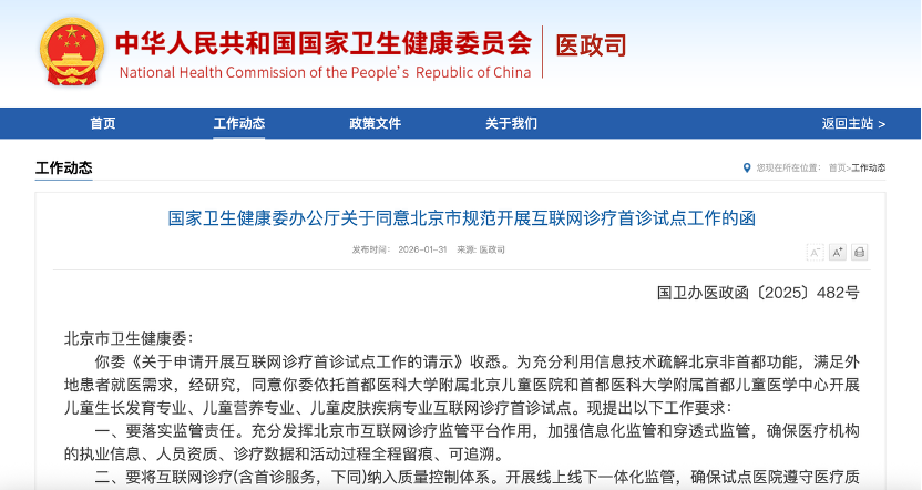 一个困扰互联网医疗行业多年的核心限制正在被打破。1月31日起,北京儿童医院和首都儿童医学中心正式开放互联网诊疗首诊服务预约,患者最快2月1日即可进行线上首诊。