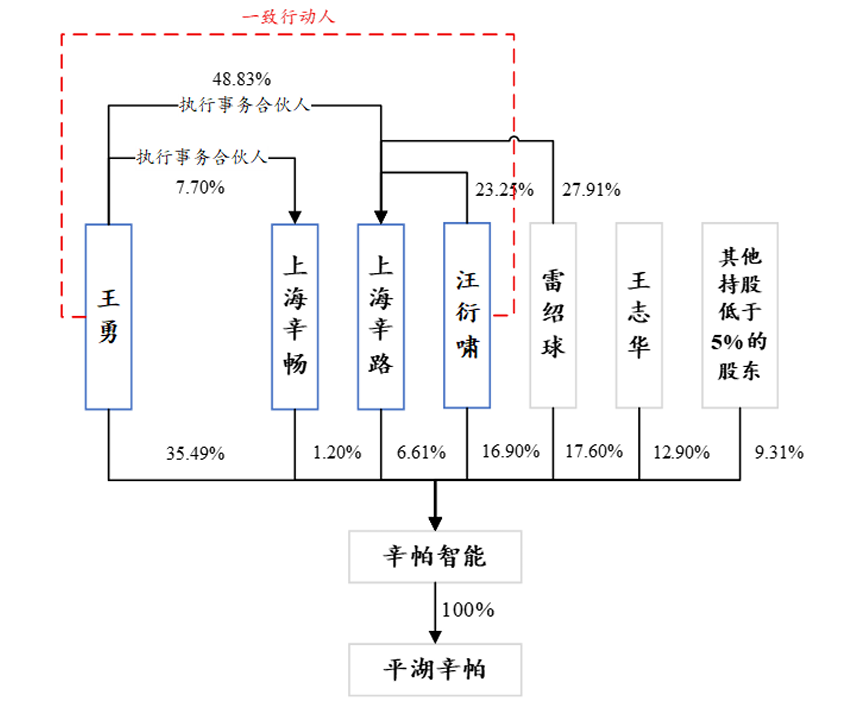 股权结构方面,王勇直接持有辛帕智能35.49%股份,通过上海辛畅、上海辛路间接控制公司7.81%股份,并通过与汪衍啸签署《一致行动人协议》,控制公司16.90%股份。其合计控制辛帕智能60.20%股份,为公司控股股东、实际控制人。