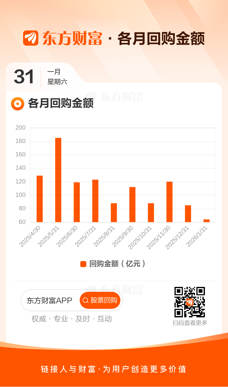 东方财富Choice数据显示,截至1月31日,1月有20家A股公司披露回购实施情况,合计回购金额63.95亿元,低于12月的85.29亿元。