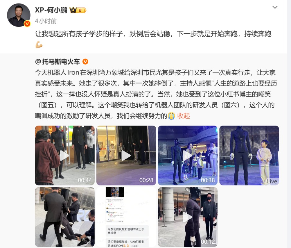 2月1日,小鹏汽车董事长、首席执行官何小鹏在其微博上回应“机器人IRON在深圳湾万象城行走摔倒”时称,“让我想起所有孩子学步的样子,跌倒后会站稳,下一步就是开始奔跑,持续奔跑”。