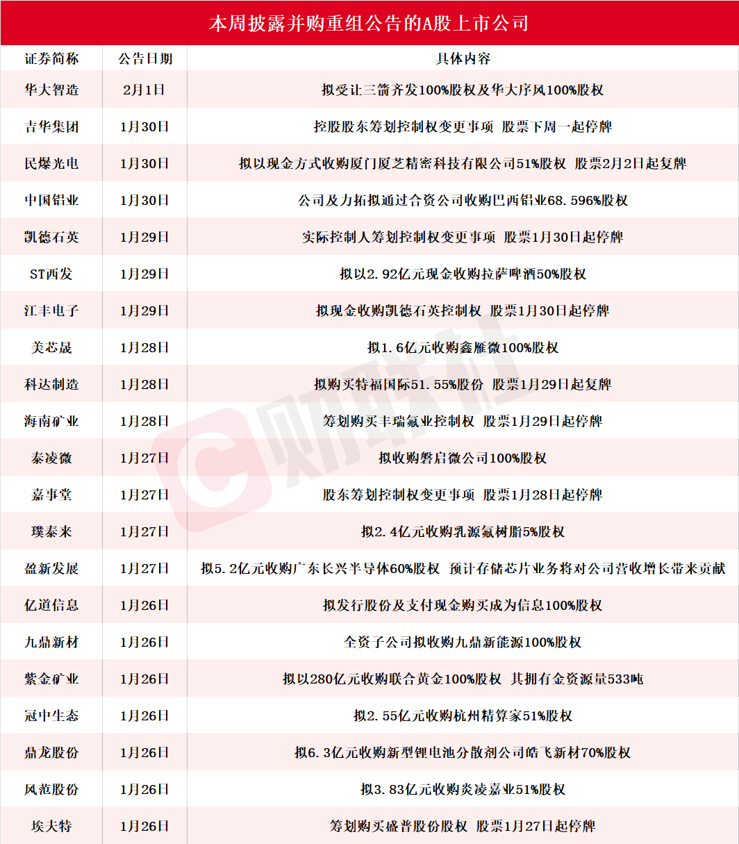 据不完全统计,截至发稿,本周(1月26日-2月1日)包括华大智造、吉华集团、民爆光电、中国铝业、凯德石英、ST西发、江丰电子、美芯晟、科达制造、海南矿业、泰凌微、嘉事堂、璞泰来、盈新发展、亿道信息、九鼎新材、紫金矿业、冠中生态、鼎龙股份、风范股份、埃夫特在内的21家A股上市公司披露并购重组进展最新公告。其中华大智造公告,拟以现金方式收购三箭齐发100%股权以及华大序风100%股权,经各方协商确认交易价格合计为3.657亿元。