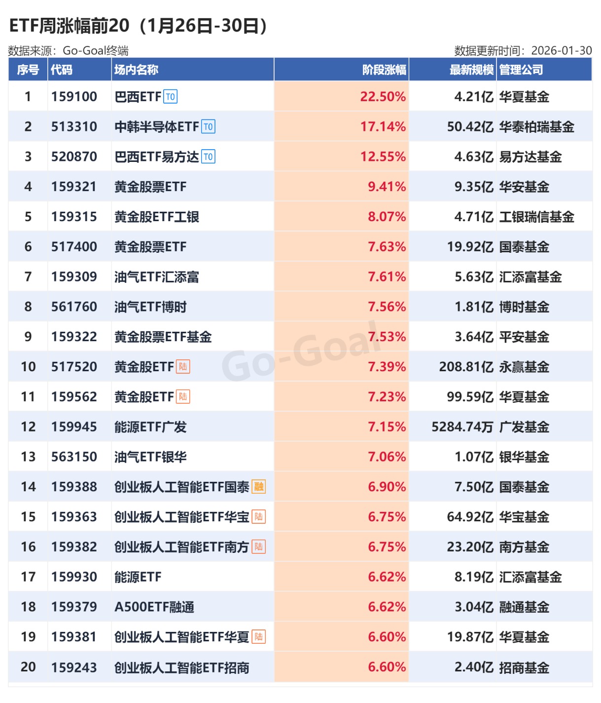 Go-Goal ETF数据显示,近期资源类与科技类行业主题ETF持续受到资金关注。巴西ETF本周涨幅居首,单周涨幅22.5%。巴西ETF大涨因其跟踪的巴西IBOVESPA指数本身表现优异,在1月底创下历史新高,核心成分股如淡水河谷和巴西石油公司受大宗商品价格上涨推动而走强。不过目前这只ETF溢价率达15.04%。