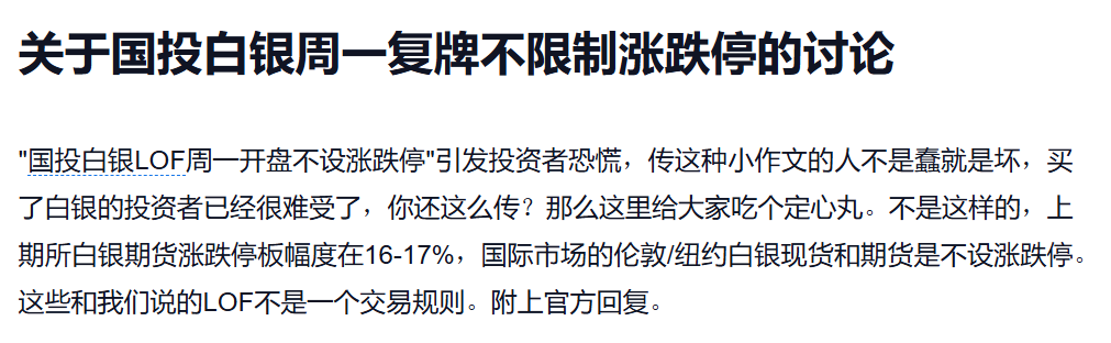 国投白银LOF的最新公告也间接进行了辟谣。公告称,该基金价格涨跌幅限制比例为10%。