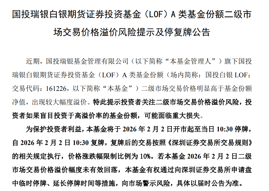 公告称,国投白银LOF基金将于2026年2月2日开市起至当日10:30 停牌,自2026年2月2日10:30复牌,复牌后的交易按照《深圳证券交易所交易规则》的相关规定执行,价格涨跌幅限制比例为10%。若该基金2026年2月2日二级市场交易价格溢价幅度未有效回落,该基金有权通过向深圳证券交易所申请盘中临时停牌、延长停牌时间等措施,向市场警示风险,具体以届时公告为准。