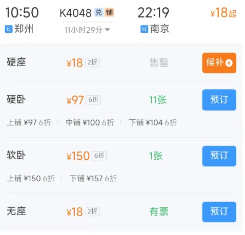 不少网友晒出的12306购票截图显示,2026年春运期间,出现了大量令人瞩目的低价票,部分火车票甚至低至1-2折,相较于平日,简直是白菜价,部分区间票更是出现了只需几元钱的情况,郑州到南京,2折后只要18元,南京到上海只要8.5元,折扣低至1.9折,南京到常州只要3.5元,低至1.7折。