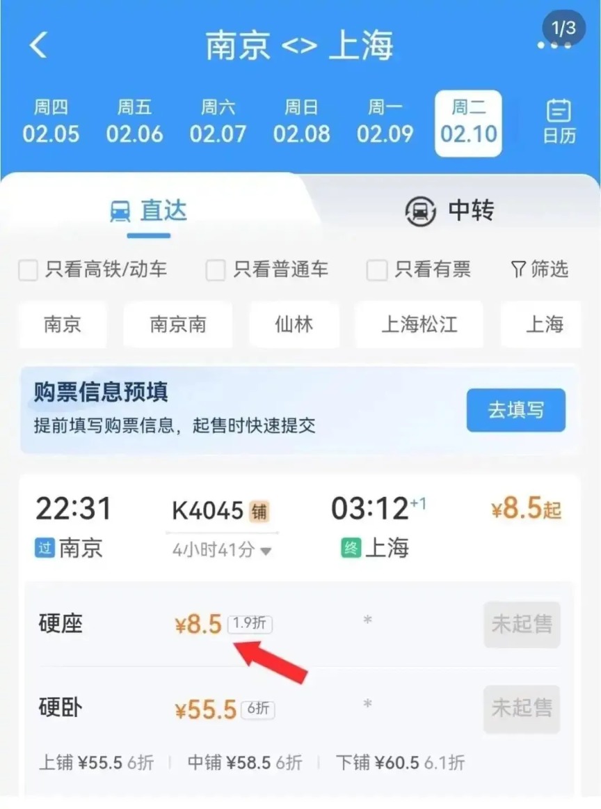 “反向春运”火了!部分火车票低至1.9折,南京到上海只要8.5元