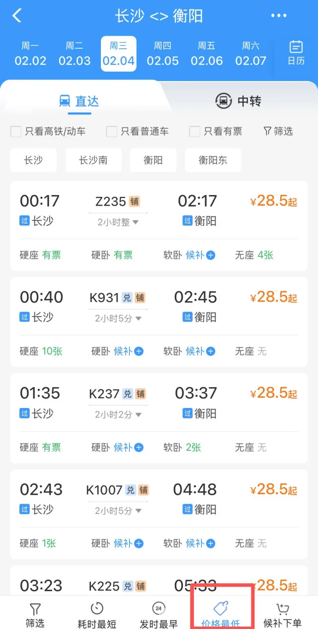 如果想要购买低价火车票,可在12306网站页面最下方点“价格最低”,筛选查询。