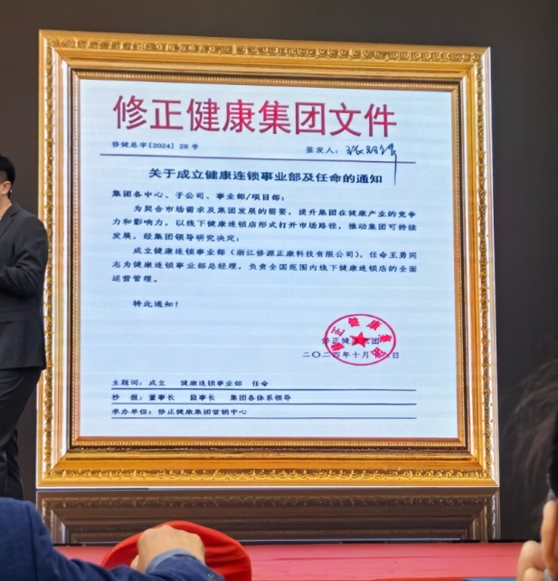 央广财经记者通过天眼查系统查询,从公开股权穿透信息来看,并未显示修源正康与修正药业存在直接关联。不过,加盟商给记者出具的一份红头文件显示,“修正健康集团”曾发文“为契合市场需求发展的需要,提升集团在健康产业的竞争力和影响力,以线下健康连锁店形式打开市场路径,推动集团可持续发展,经集团领导研究决定:成立健康连锁事业部(浙江修源正康科技有限公司)。”