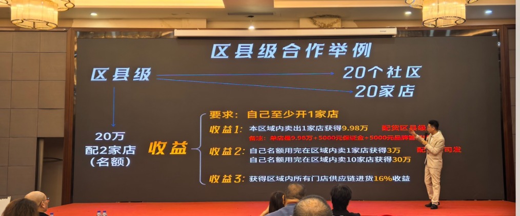 除品牌授权争议外,该招商项目的运作模式也引发加盟商质疑。王先生透露,根据招商会议资料,参与者需缴纳20万至100万元不等费用成为“合伙人”,“收益主要来源于发展下线的奖励,直接发展一家门店可获9.98万元,还能享受团队提成。”
