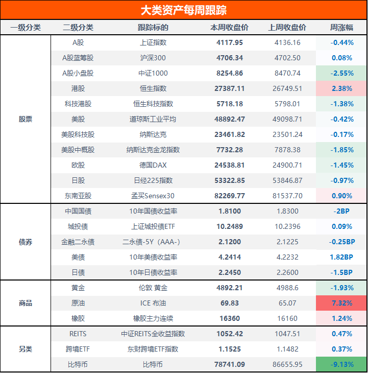 美股本周高位震荡回落,道琼斯指数下跌0.42%,纳斯达克指数回调0.17%,德国DAX指数下跌1.45%;黄金高位巨震,一度涨近5600美元,最终收跌1.93,失守4900美元;原油大涨7.32%,比特币暴跌超9%。