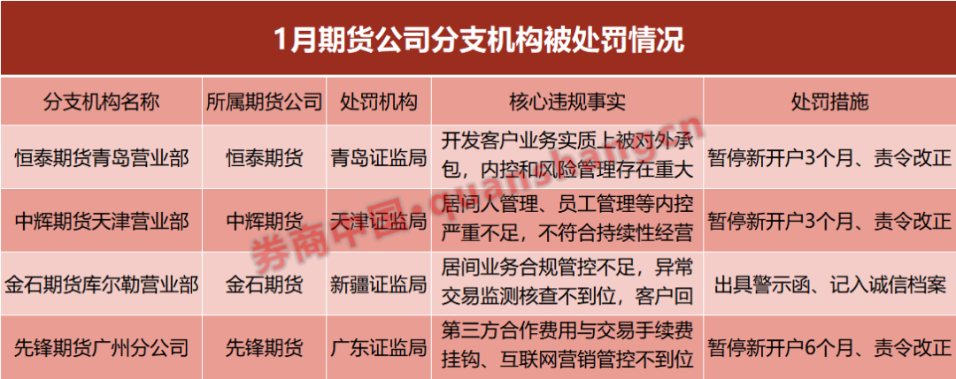 据不完全统计,2026年1月,多地证监局已对相关期货公司开出6张罚单,实施多起行政监管措施。金元期货、先锋期货、华金期货、恒泰期货、中辉期货、国新国证期货等卷入其中。